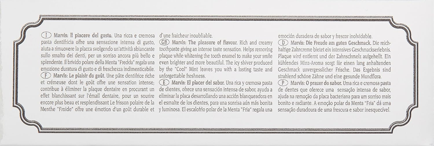 Marvis Whitening, with a sharp taste of cool mint for a pleasant and lasting freshness, carries out a whitening activity on your teeth for a more beautiful and splendid smile.