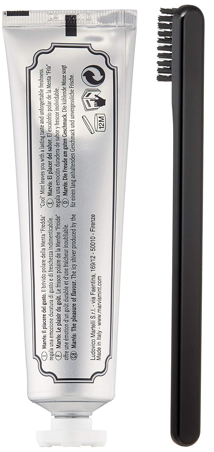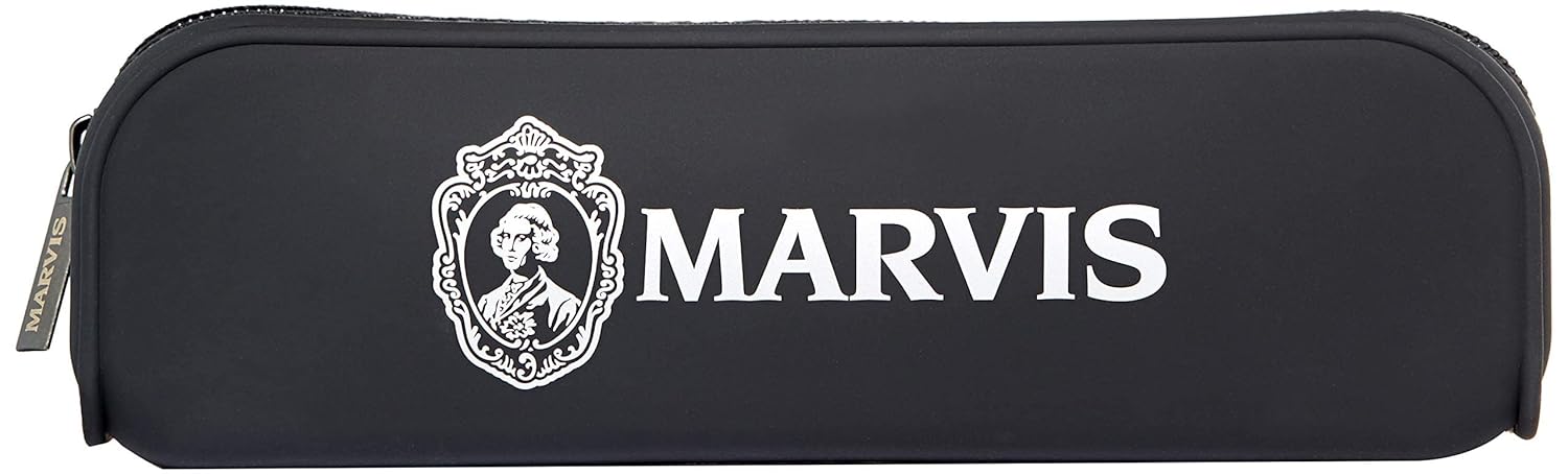 This rubberized travel bag contains Marvis favorites Whitening Mint Toothpaste (75ml) and medium nylon bristle toothbrush.
